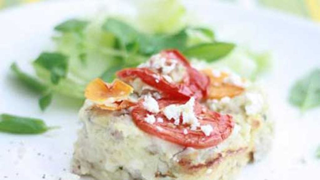 Lisää perunamuusi. Mausta suolalla, pippurilla ja yrteillä. Kaada (voideltuun) uunivuokaan ja tasoita pinta.