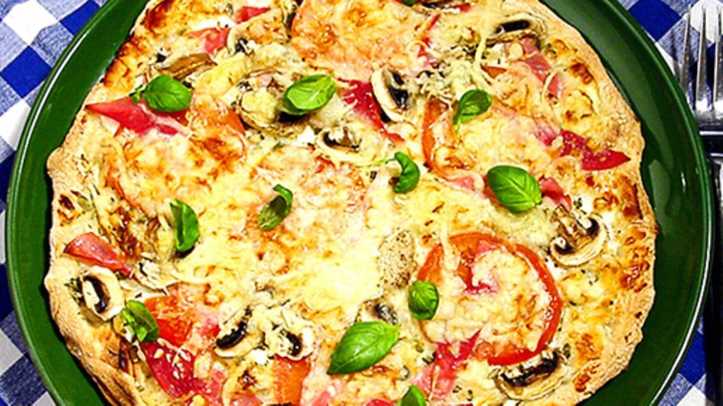 3. Vaivaa taikina kevyesti. Kaulitse suoraan leivinpaperille isoksi pizzaksi tai neljäksi pienemmäksi. Levitä rahka pizzoille. Lado päälle tomaattiviipaleita. Ripottele päälle herkkusieniä, kinkkua ja puolet oreganosta tai basilikasta. Ripottele päälle juustoraaste. Paista uunin keskitasolla n. 10-15 minuuttia. Koristele lopulla basilikalla tai oreganolla.