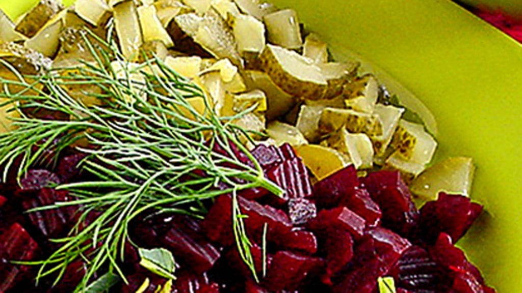 2. Hienonna punajuuret ja suolakurkku sekä purjo. Asettele ne raidoiksi sillin päälle. Koristele tillillä.
