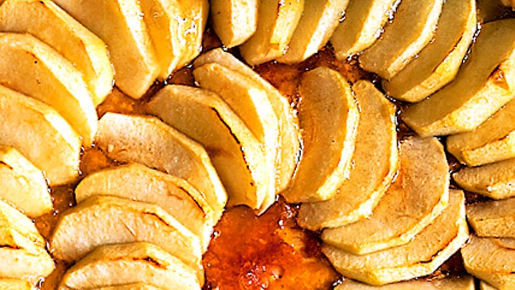 3. Ota vuoka uunista. ja poista folio. Lado ohuet omenalohkot piiraspohjalle. Paista kypsäksi 15-20 minuuttia. Sulata hyytelö ja lusikoi se valmiin piiraan päälle.
