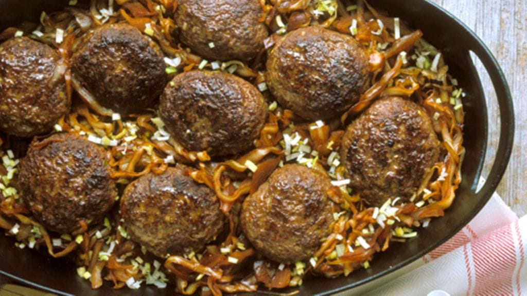 1. Sekoita jauhelihaan muut ainekset. Muotoile isoja pyöryköitä ja ruskista ne hyvin kauttaaltaan öljyssä pannulla.