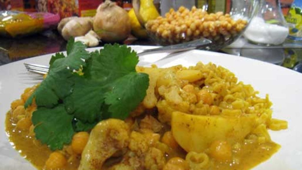 Lisää kookosmaito ja hauduta miedolla lämmöllä noin 20 minuuttia, kunnes kasvikset ovat melkein kypsiä. Lisää joukkoon kypsät kikherneet ja kiehauta. Sekoita lopuksi mukaan hienonnettu korianteri tai persilja .