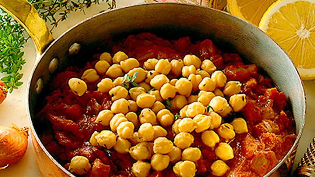 2. Lämmitä öljyä padassa tai paistokasarissa ja kuullota sipulisilppu, rosepippurimurska, korianteri, muskotti ja curry. Lisää tomaatit, vihannesliemi, suola ja sitruunamehu. Purista joukkoon valkosipulinkynnet. Keitä poristen 10 minuuttia. Lisää kikherneet ja anna porista vielä 5 minuuttia.