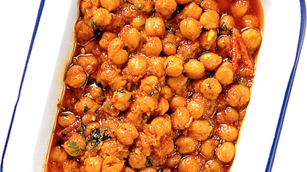 3. Lisää kikherneet, tomaatit, suola ja 1 dl vettä. Anna kiehua kunnes lähes kaikki vesi on haihtunut. Pirskota päälle sitruunamehua. Koristele korianterilla ja vihreällä chilillä.