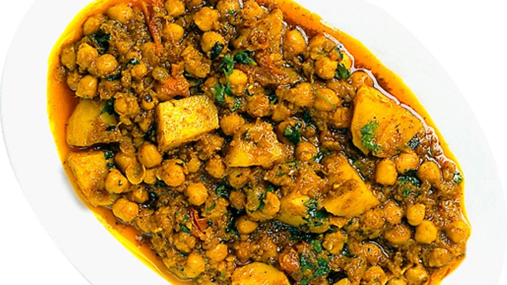 3. Kaada joukkoon kikherneet, sekoita ja anna hautua 2-3 minuuttia, kunnes herneet ovat lämmenneet. Sekoita varovasti joukkoon perunat ja anna hautua vielä muutaman minuutin. Ripottele päälle lopuksi korianteria ja garam masalaa.