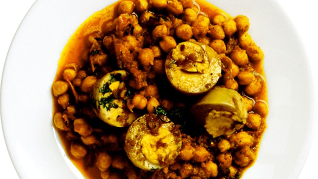 3. Lisää kikherneet, sekoita ja hauduta 3-4 minuuttia, kunnes herneet ovat lämmenneet ja sekoittuneet kastikkeeseen. Lisää korianteri ja munanpuolikkaat. Ripottele pinnalle garam masala.