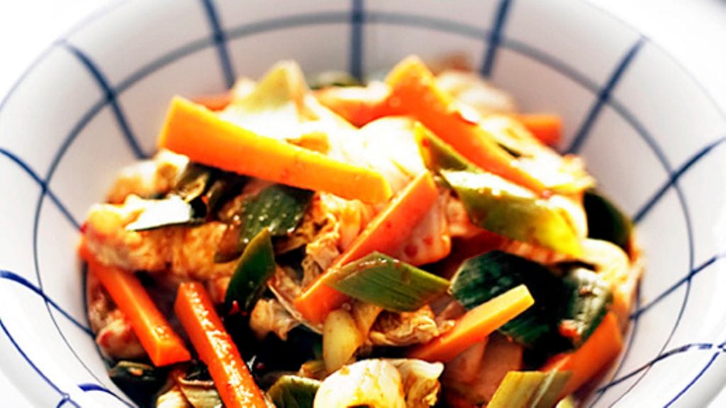 1. Leikkaa pois kaalin kanta ja leikkaa kaali isohkoiksi paloiksi 4x4 cm. Kuori ja suikaloi porkkanat, puhdista ja suikaloi purjo. Kiehauta vesi, viinietikka ja suola isossa padassa. Keitä porkkanasuikaleita vedessä 3 minuuttia, nosta liemestä ja jäähdytä. Keitä sitten kaalia ja purjoa noin minuutti. Siivilöi liemestä ja anna myös jäähtyä.