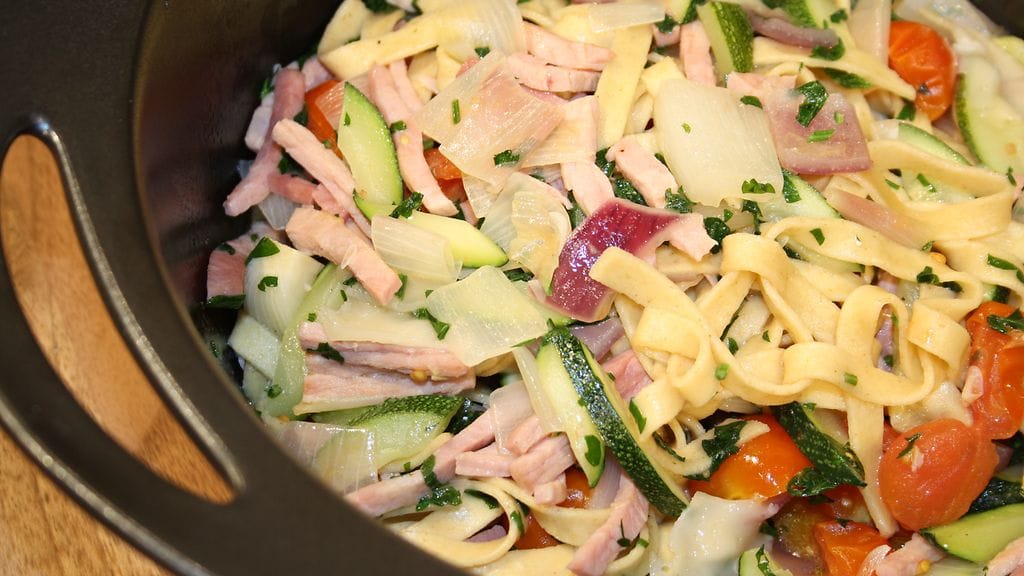 Paloittele kinkku, salottisipuli sekä kesäkurpitsa kuutioiksi ja halkaise tomaatit. Paista kinkku kattilassa tilkassa öljyä kullanruskeaksi. Lisää kasvikset kuullota hieman. Lisää keitetty pasta ja tilkka vettä, sekä voi. Mausta sitruunanmehulla sekä parmesaaniraasteella. Tarkista maku.