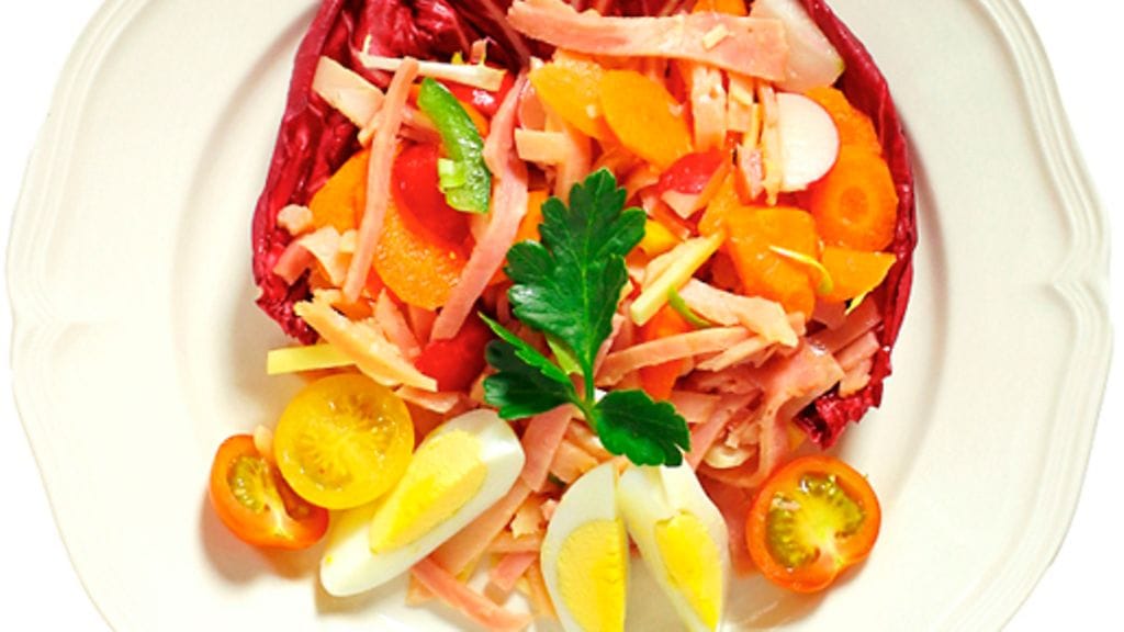 3. Asettele salaatinlehdet neljälle asetille. Annostele paprika, retiisit, paprikat ja kinkku salaatinlehtien päälle. Kuori kananmunat ja lohko ne.. Koristele salaatti persiljalla, kananmunalla ja tomaatilla. Pirskota päälle viinietikkakastiketta.