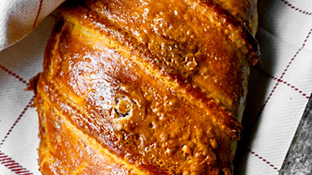 5. Penslaa piirakka munanvalkuaisella. Pistä siihen muutama ilmareikä. Paista uunin keskitasolla n. 30 minuuttia.