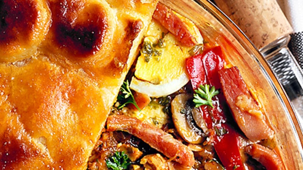 6. Kaulitse taikina kanneksi ja peitä vuoka. Pistä kanteen muutama ilmareikä. Käytä mahdollista ylijäämätaikinaa koristeluun. Paista uunin keskitasolla n. 30 minuuttia.