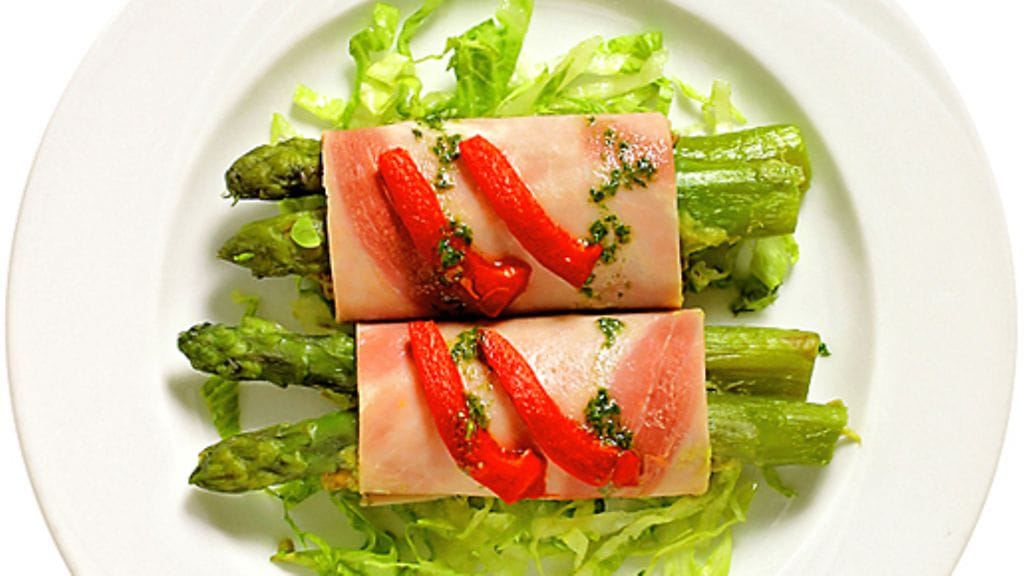 2. Asettele avokadoseosta kinkkuviipaleille, päälle parsaa ja kääri rullalle.