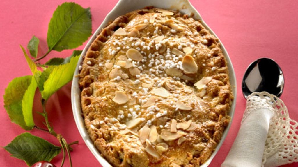 Kaaviloi paketin toisesta levystä piirakkavuoan kokoinen kansilevy leivinpaperin päällä. Kumoa se siitä piirakan päälle. Voit tehdä kanteen koristeviiltoja veitsellä. Voitele munalla ja ripottele pinnalle mantelilastuja ja raesokeria. Paista 175-asteisen uunin alatasolla 20-30 minuuttia. Tarjoile vaniljakastikkeen tai jäätelön kanssa.