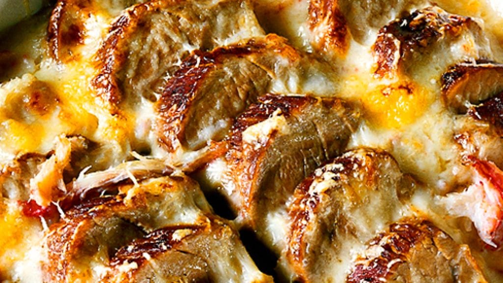 4. Viipaloi filee, laita se uunivuokaan, levitä päälle rapumuhennos. Ripottele päälle juustoraastetta ja gratinoi uunissa kunnes juusto on sulanut.