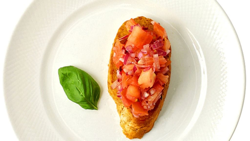 1. Ota tomaatit esiin ajoissa, jotta ne ehtivät lämmetä huoneenlämpöisiksi. Hienonna punasipuli, tomaatit ja ¾ basilikasta. Säästä muutama kaunis lehti koristeluun. Sekoita tomaatteihin sipulisilppu, puristettu valkosipuli, basilika ja öljy. Mausta suolalla ja mustapippurilla.
