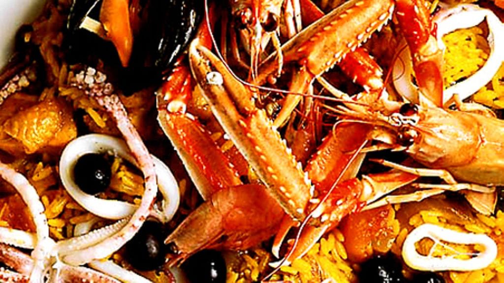 2. Purista mukaan sitruunamehu, lisää kanaliemi ja simpukoiden liemi, mausta sahramilla, suolalla, mustapippurilla ja cayennepippurilla. Lisää kana ja sianliha, anna poreilla miedolla lämmöllä kannen alla 15-20 minuuttia. Lisää kalat ja äyriäiset ja anna vielä poreilla 5 minuuttia. Anna paellan levätä muutama minuutti, koristele se sitten oliiveilla. Tarjoile sitruunalohkojen kera.
