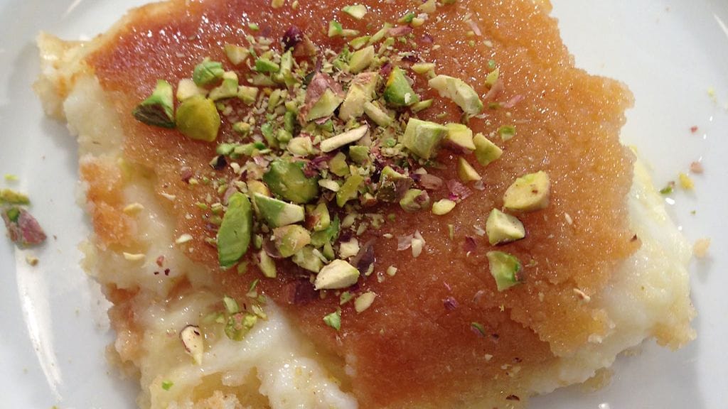 6. Valmista siirappi kiehauttamalla sokeria ja vettä kattilassa noin neljän minuutin ajan. Lisää sitruunamehu ja nosta pois liedeltä. Anna jäähtyä. Lisää ruusu- ja appelsiininkukkavedet.7. Kumoa kakku tarjoiluastiaan. Koristele pähkinärouheella ja tarjoile lämpimänä sokerisiirapin kanssa.