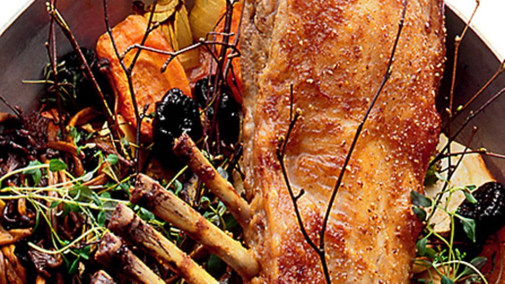 1. Hiero lihaan kauttaaltaan suolaa ja pippuria. Kuori ja kuutioi sipuli, porkkanat ja selleri. Laita uunipannulle koivuoksia ja sipuli- ja juureskuutiot sekä timjami ja laakerinlehti. Aseta ritilä uunipannun päälle ja liha sille. Paina lihalämpömittari lihan paksuimpaan kohtaan. Kaada uunipannulle hieman lihalientä ja lisää sitä pikkuhiljaa paistamisen aikana.