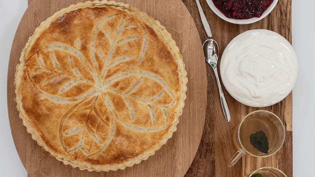 TAIKINAN VALMISTUS: Sekoita vehnäjauhot ja leivinjauhe. Lisää 190 g voita ja nypi murumaiseksi seokseksi. Lisää vesi ja sekoita nopeasti tasaiseksi. Kauli noin 1 cm paksuksi levyksi ja lisää loppu voi ohuina siivuina puolikkaan päälle. Kääntele reunat tiiviisti päälle ja taittele paketti kaksin kerroin. Kaulitse pitkulaiseksi ja taittele 3 kerroin. Jos mahdollista laita jääkaappiin 15 minuutiksi ja toista tämä vaihe 2-3 kertaa. Laita kylmään odottamaan käyttöä. Jaa taikina kahteen osaan ja kaulitse noin 5 mm paksuksi kerrokseksi. Painele toinen osa voidellun irtopohjapiirakkavuoan pohjalla, lisää täyte ja toinen taikinanpuolisko kanneksi.