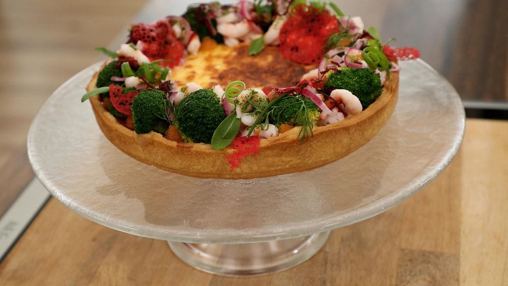 PÄÄLLE: Laita jäähtyneen piirakan päälle esikeitettyä parsakaalia, katkarapuja, muikunmätiä, hillottua punasipulia sekä nobiskastiketta ja tilliöljyä maun mukaan. Koristele versonlehdillä, koralleilla, friteeratulla punajuurella ja ruohosipulilla ja kevätsipulikiharoilla.