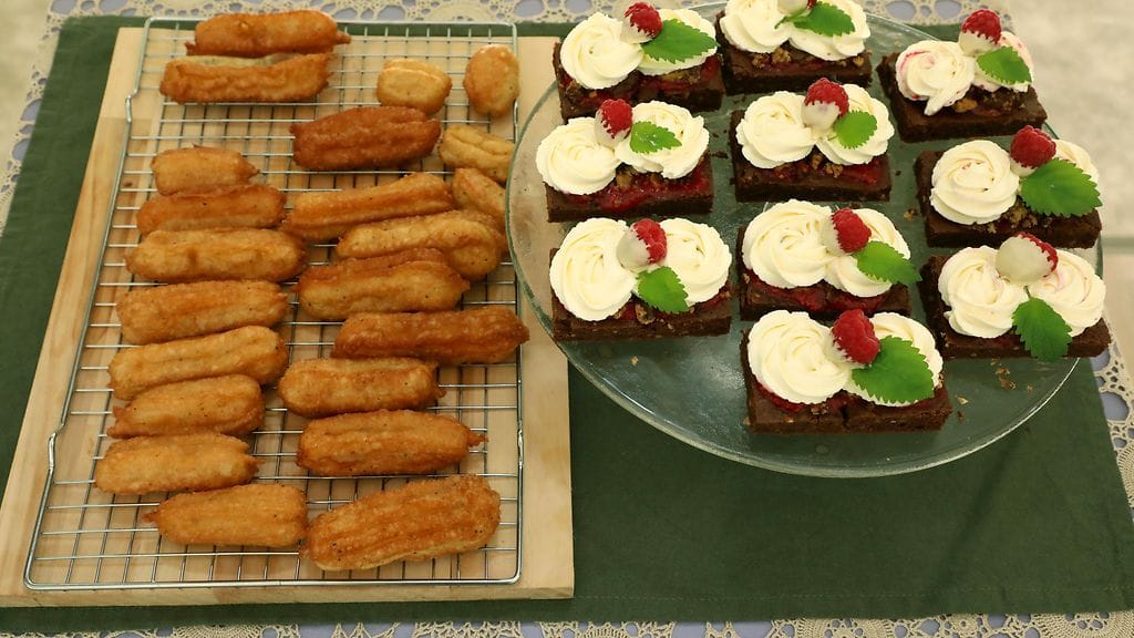 Kokoaminen: kostuta jäähtynyt browniepohja pikakahvilla. Sivele pinnalle vadelma-puolukkamelbaa (jätä noin 1/3 koristelua varten). Leikkaa levystä kymmenen tasakokoista leivosta. Lisää murennettu suklaacrumble ja laita churro leivoksen toiseen laitaan viistoittain. Pursota kermatäytteestä ruusuke/ ruusukkeita lopun näkyvillä olevan crumblen päälle. Koristele asettelemalla churrojen /kermaruusukkeiden päälle tuoreita suklaassa dipattuja vadelmia, tuoreita puolukoita, sulatettua suklaata raitoina sekä vadelma-puolukkamelbaa raitoina. Viimeistele sitruunamelissan lehdillä.