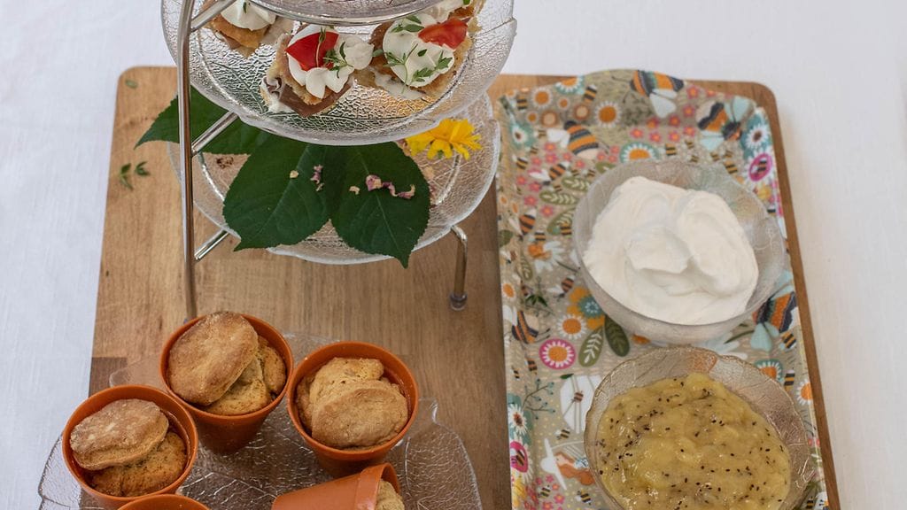 KEHÄKUKKA-SKONSSIT HILLOLLA JA LAVENTELI-HUNAJAKERMALLA: Sekoita kauramaito ja sitruunan mehu. Lämmitä mikrossa hetki niin, että maito juoksettuu hieman, näin syntyy kauramaidosta ”piimä”, mikä on yksi ainesosista skonssien reseptissä. Jäähdytä. Sekoita kaikki kuivat aineet ja terälehdet keskenään. Nypi margariini jauhon sekaan niin, että se ei ole isoina palasina. Sekoita joukkoon kauramaito. Sekoita vain sen verran kuin on tarpeellista. Muotoile taikinasta ympyrä (halkaisija 18 cm) ja leikkaa 6 sektoriksi, saat kolmion muotoiset skonssit. Sekoita keltuaisen ja vesi. Voitele skonssit. Paista uunin keskitasolla 10 min 220 asteessa.
