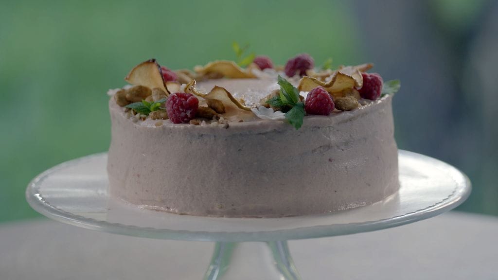 KORISTELE KAKKU: Kuorruta tuorejuusto-valkosuklaaseoksella ja tasoita sivut raapan tai palettiveitsen avulla. Vedä sivureunoihin aaltokuviota palettiveitsen avulla pyörivän alustan liikettä hyödyntäen. Pursota kakun päälle viisi ruusuketta. Laita ruusukkeiden väliin pystyyn omenasiivu, tuoreita vadelmia, paahdettuja manteleita ja sokerimassakukkia. Ripottele kevyesti mantelirouhetta koristeiden sekaan.