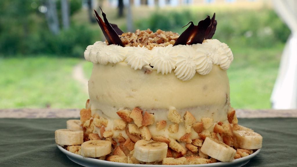 Pohjaa varten sekoita isossa kulhossa kaikki kuivat aineet. Sekoita huoneenlämpöinen voi joukkoon sähkövatkaimella sekoittaen. Muusaa banaanit ja sekoita joukkoon. Lisää kananmunat ja viimeiseksi maito. Sekoita tasaiseksi ja kaada kolmeen noin 15cm halkaisijalla olevaan vuokaan. Paista 175 asteessa noin 20-25min. Anna jäähtyä.