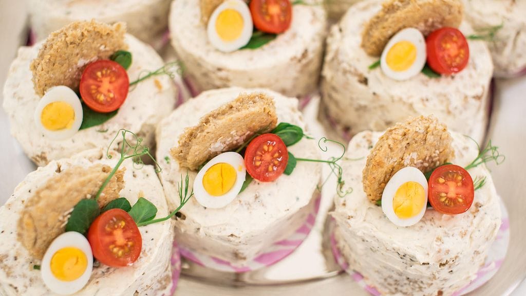 LISÄKSI: Keitä viiriäisen munia kiehuvassa vedessä 3 minuuttia. Kaada vesi pois ja anna kuorten kuivahtaa. Jäähdytä kylmässä vedessä. Leikkaa viiriäisen munat kahtia ja irrota kuoret. Koristele leivonnainen mieleiseksesi käyttäen tuoreita kasviksia ja yrttejä.