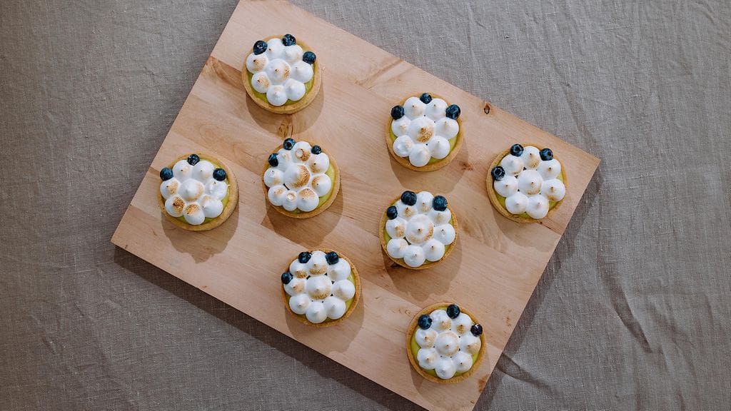 LEIVOSTEN KOKOAMINEN JA KORISTELU: Laita leivosten pohjalle ensin noin ruokalusikallinen mustikkahilloa. Laita seuraavaksi sitruunatäytettä niin, että leivospohja on täynnä reunoihin saakka. Nostele marenkivaahto nuolijan avulla pursotinpussiin jossa valitsemasi tylla ja pursota leivoksen päälle kaunis marenkikerros. Paahda tohottimella pintaa varovasti. Koristele tuoreilla marjoilla ja syötävillä kukilla.