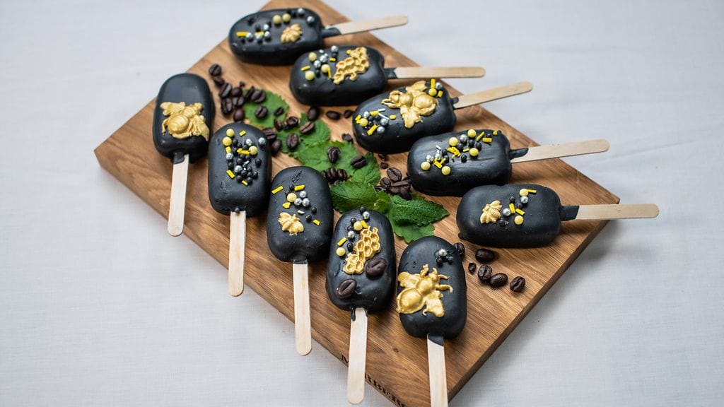 Aseta leivinpaperille ja asettele heti päälle koristerakeita ja ampiaiskoristeita ennen kuin kuorrute kovettuu.