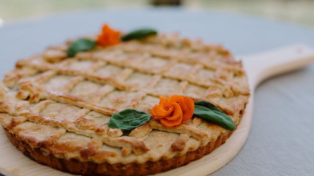 JUUSTO-KERMAVIILIPOHJA: Yhdistä juustoraaste ja pohjan kuivat aineet. Sekoita kädellä vaivaamalla joukkoon kermaviili ja öljy. Voitele halkaisijaltaan 27 cm kokoinen piirakkavuoka vuokaspraylla. Taputtele taikina piirakkavuoan pohjalle ja reunoille. Esipaista pohjaa 200 asteisessa uunissa n.10 min.