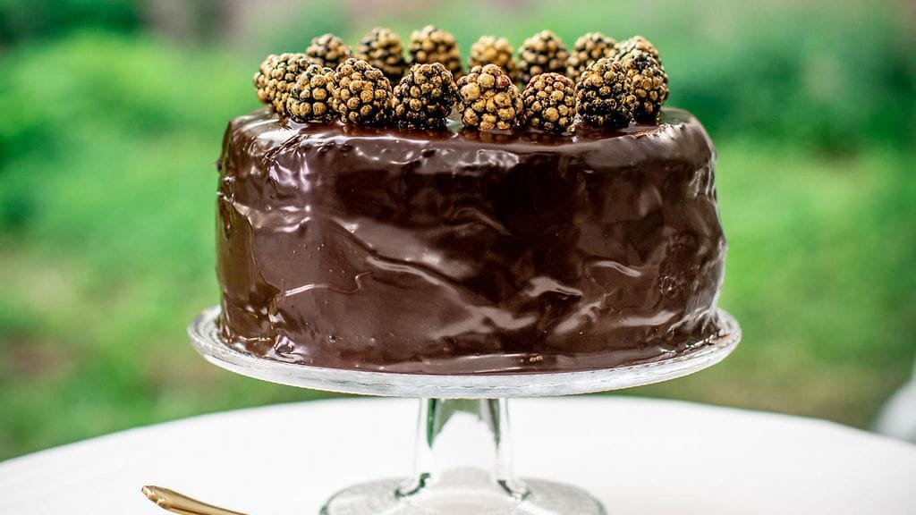 22. Viimeistele kakun koristelu syötävällä kullalla kuorrutetuilla karhunvatukoilla