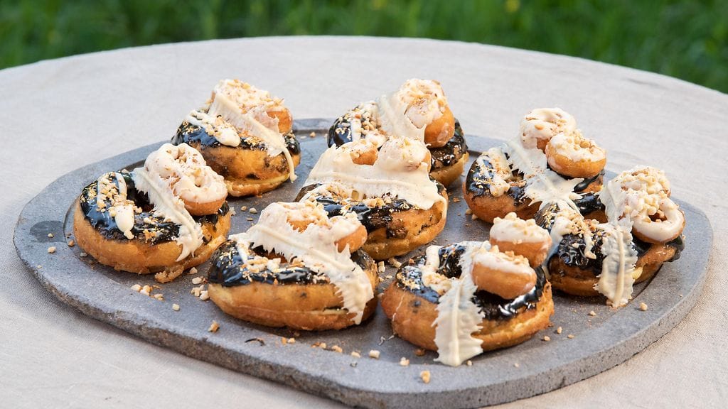 DONITSIEN TÄYTTÄMINEN JA KORISTELU: Pursota vaniljakreemiä donitsien sisään muutamasta eri kohdasta. Kasta donitsit salmiakki-valkosuklaakuorrutteessa.