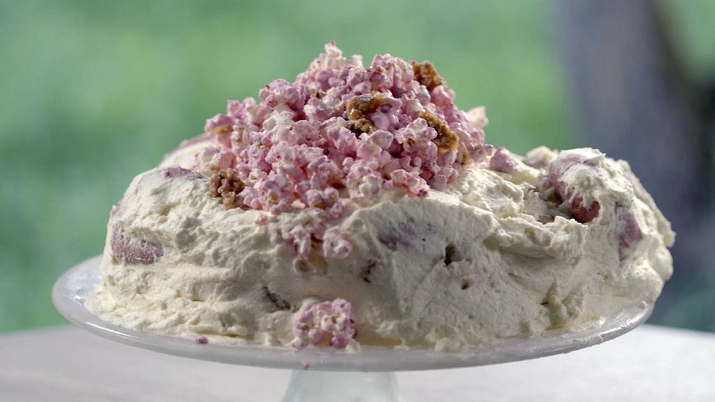 Siivilöi pienellä siivilällä mansikalla maustettua tomusokeria popcornien päälle. Anna koristeen jähmettyä täysin ennen kakun päälle asettelua.