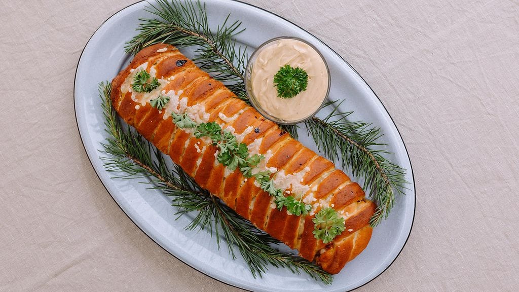 KORISTELU JA TARJOULU: Kun kranssi on hieman jäähtynyt, koristele tuoreella persiljalla ja havun oksilla. Tarjoile vetyleipäpitko dipin kanssa.