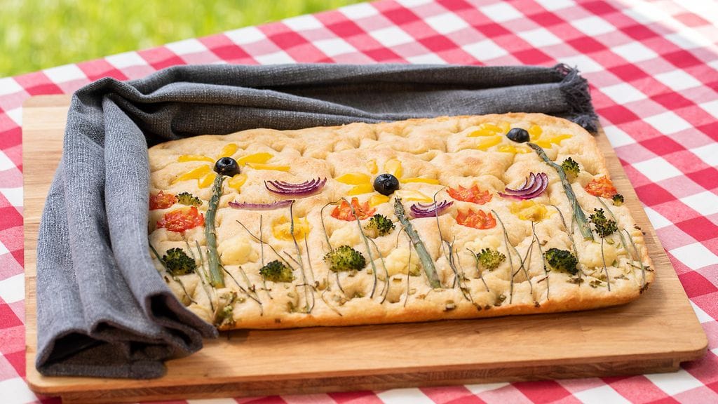 FOCACCIA: Sekoita kulhossa vesi, sokeri kuivahiiva ja 200 g vehnäjauhoja. Peitä kulho muovilla tai kelmulla ja jätä lämpimään paikkaan vähintään 15 minuutiksi. Sekoita joukkoon loput vehnäjauhot ja vaivaa taikinaksi. Lisää lopuksi suola ja öljy ja vaivaa taikina niin, että se on hyväsitkoinen ja löysähkö. Laita taikina oliiviöljyllä voideltuun kulhoon, peitä muovilla ja kohota. Voitele uunivuoka (30 x 40 cm) oliiviöljyllä tai voit laittaa vuoan pohjalle ja reunoille leivinpaperin, jonka voitelet oliiviöljyllä. Levitä taikina varovasti vuokaan. Anna kohota muovin alla peitettynä.