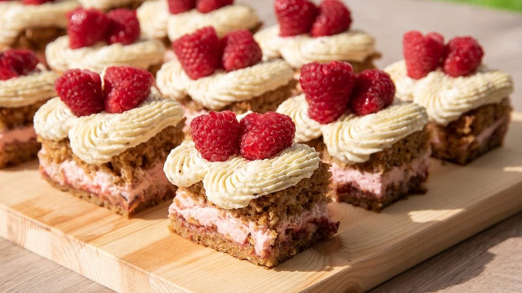 VIIMEISTELY: Tasoita leivoksen reunat, ja leikkaa leivos 12kpl tasakokoiseksi palaksi. Pursota hasselpähkinävoikreemi kauniiksi pursotuksiksi leivosten päälle. Koristele vielä tuoreilla vadelmilla. Nosta tarjoiluvadille.