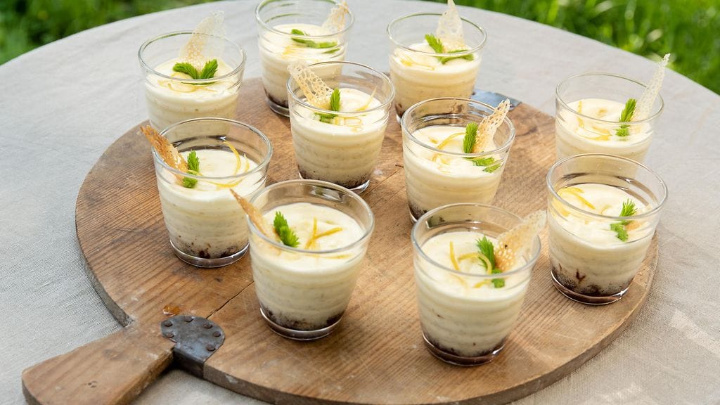 KAKKUPOHJA: Laita uuni kuumenemaan 140 asteeseen. Asettele lasit tai pienet uunivuoat uunipellille. Sulata voi ja anna jäähtyä. Jauha pekaanipähkinät hienoksi jauhoksi. Sekoita vehnäjauhot, leivinjauhe, kaakao, pähkinäjauho sekä fariinisokeri keskenään. Lisää voisula ja kerma jauhoihin ja sekoita. Jaa taikina tasaisesti juomalasien tai uunivuokien pohjille.