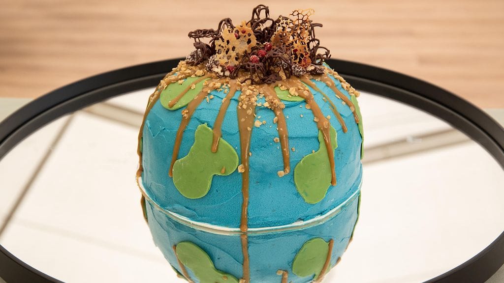 KAKUN KORISTELU: Kun kakku on hyytynyt, avaa kelmut pohjan päältä, nosta kakkulautanen kakkukulhon päälle ja kippaa kakku lautaselle. Poista kelmu. Kuorruta kakku sinisellä kreemillä. Asettele vihreät sokerimassakoristeet kreemin päälle. Kaada kinuski kakun päälle, anna valua reunoille. Koristele kakku sivuun otetuilla puolukoilla, crumblella, suklaakoristeilla sekä Coral tuilella.