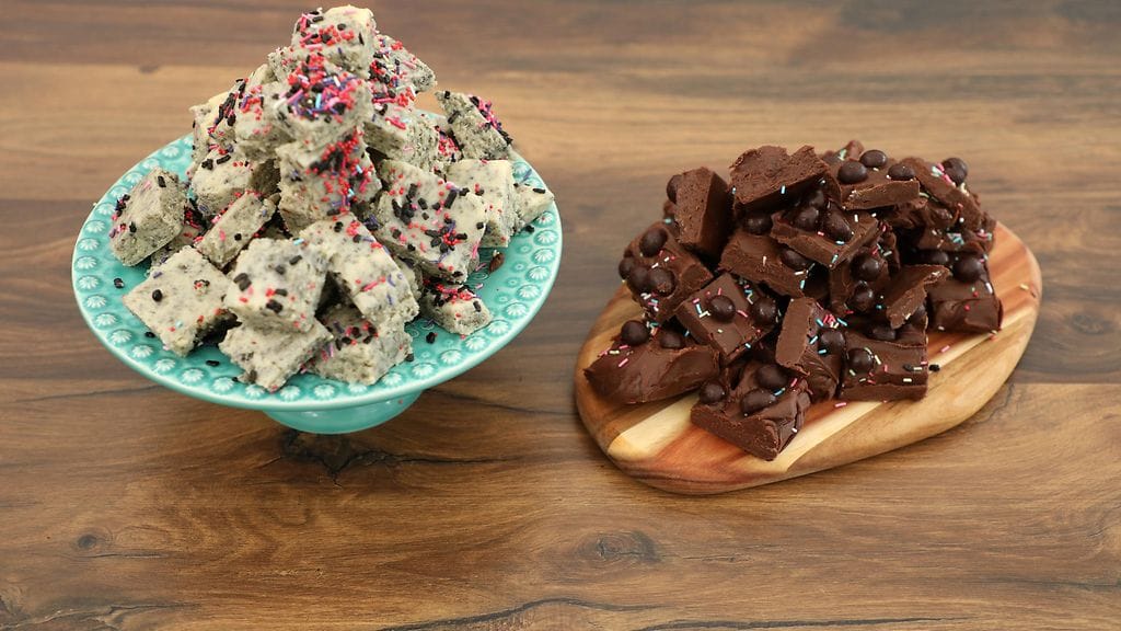 MOKKAPALAFUDGET: Vuoraa noin 20 cm x 25 cm suorakaiteen muotoinen vuoka leivinpaperilla. Liuota kahvirouhe lusikalliseen kuumaa vettä. Paloittele maitosuklaa vesihauteessa olevaan kulhoon. Kaada päälle kondensoitu maito sekä kahvi ja sulata kevyesti sekoitellen. Kun seos on sulanut tasaiseksi, ota kulho pois vesihauteesta. Levitä massa esivalmisteltuun vuokaan. Koristele strösseleillä ja makeisilla. Anna kovettua kylmässä ja leikkaa jähmettyneenä paloiksi.