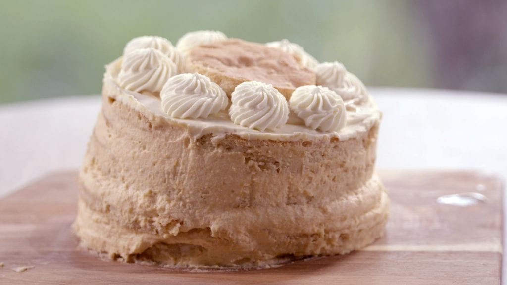 Tee valkosuklaakreemi ja levitä se tasaisesti kakun pinnalle. Anna kylmetä hetki pakastimessa. Valuta kinuski ja tee kreemistä pursotukset kakun päälle.