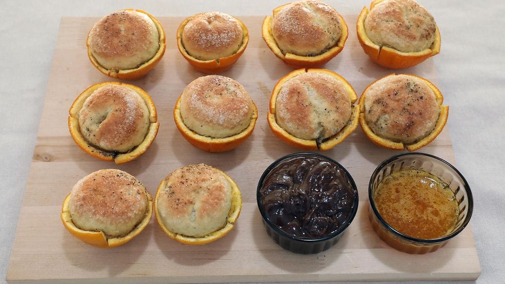 OHJE: Leikkaa appelsiinit puoliksi ja purista niistä mehut sitruspuristimella. Säästä kuoret. Sulata voi ja jätä jäähtymään. Lämmitä maito kädenlämpöiseksi ja murustele sekä liota siihen hiiva hyvin. Lisää sokeri ja kardemumma sekä puolet voisulasta. Vaivaa jauhot sekaan. Lisää loput voisulasta ja vaivaa se taikinaan. Laita leivinliina taikinakulhon päälle ja jätä pullataikina nousemaan noin 20 minuutin ajaksi lämpimään. Pullataikinan noustessa tee voinappi ja suklaakastike.