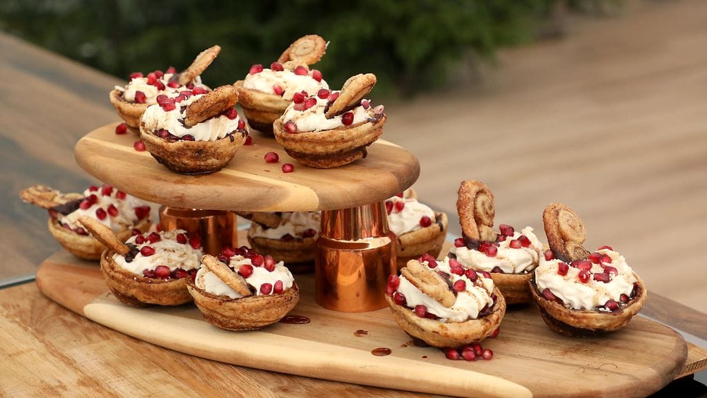 SPELTILLA RIKASTETTU ROUHEA VOITAIKINA: Sekoita jauhot ja suola. Nypi kylmä voi jauhojen sekaan "liuskoiksi". Saa jäädä isojakin liuskoja, jotka taikinan sisällä sulaessaan muodostavat lehtevyyden. Kaada sekaan kylmä juuri ja vesi. Sekoita juuri sen verran, että taikina pysyy kasassa. Kääri kelmuun ja anna jähmettyä jääkaapissa vähintään 20 minuuttia. Ota taikina kylmästä ja kauli siitä suorakulmio noin 20 cm x 50 cm. Taittele taikina kolmeen osaan ja laita taas jääkaappiin 20 minuutiksi. Jos on aikaa niin taikina pärjää jääkaapissa useamman päivän ja odottaa sinua kun ehdit sen paistamaan. Ota taikina jääkaapista. Kauli noin 5 mm paksuksi suorakaiteeksi. Levitä kaulitulle taikinalevylle sulatettu voi, sokeri ja piparkakkumauste. Kääri taikina rullalle. Leikkaa rullasta noin 3 cm leveitä paloja. Aseta palaset pöydälle niin, että näet "rullakuvion”. Kauli palaset kelmun alla noin 10-12 cm pyörylöiksi ja aseta väärinpäin olevalle muffinipellille, voidellun kohouman päälle. Paista 225 asteessa 10-15 minuuttia, kunnes kupit ovat kypsiä ja rapeita. Paistoaika riippuu taikinan paksuudesta. Anna jäähtyä ja valele kupin sisus suklaaganachella.
