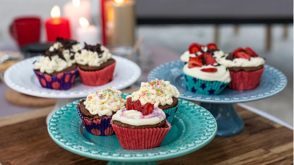 KORISTELU: Vaahdota kerma. Sekoita joukkoon tuorejuusto (tehdään ainakin kaksi eri kuorrutetta muffinsseihin). Mausta murskatuilla piparkakuilla, kanelillaja appelsiinillä. Viimeistele muffinssit suklaarouheella, piparkakku muruilla, st ja piparkakuilla.