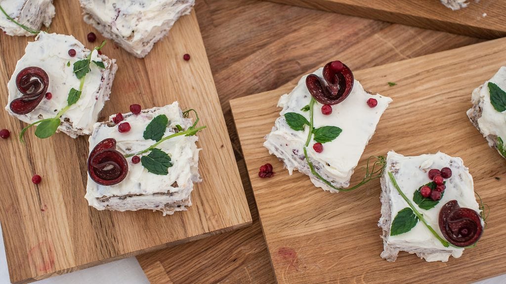 Paista kantarellit pannussa voissa ja mausta suolalla, pippurilla ja galangalilla. Sekoita smetana, tuorejuusto ja kantarellit keskenään. Sekoita tuorejuusto ja ranskankerma. Laita sekaan pororouhe, pippuri ja suola. Laita kattilaan pari ruokalusikallista vettä, 0,5 dl sokeria ja puolukat. Jauha red szechuan ja lisää varovasti pikku hyppysellinen. Leikkaa leivät, jos eivät ole siivuina. Kostuta vichyllä. Laita pohjakerrokseen kantarellitäyte. Laita toinen leipä päälle ja seuraavaan kerrokseen porotäyte. Sekoita ranskankerma ja tuorejuusto. Päällystä kakku tällä seoksella. Koristele puolukoilla, suolakurkulla, red szchuanilla ja kylmäsavuporoleikkeleillä.