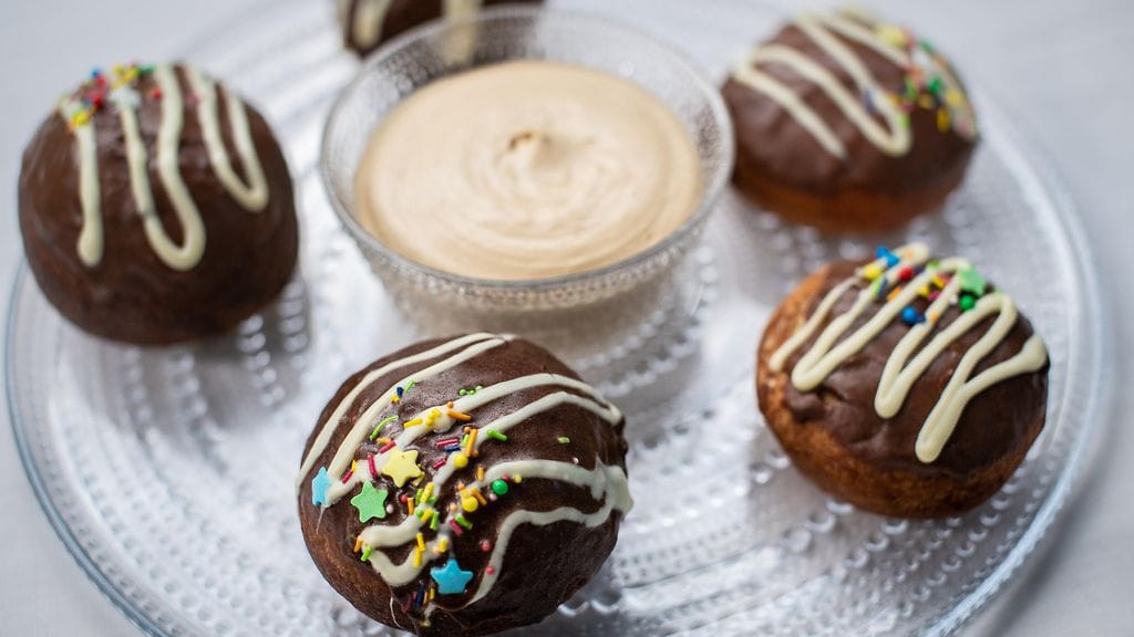 DONITSIT: Sekoita kylmä maito ja lämmin kahvi keskenään. Varmista, että seoksesta tulee kädenlämpöistä. Liota hiiva maitokahviseokseen. Lisää joukkoon sokeri, suola ja kananmuna. Sekoita joukkoon puolet vehnäjauhoista ja vatkaa taikinaa, jotta taikina saa ilmaa ja sitkoa muodostuu. Vaivaa joukkoon loput jauhot ja vaivaamisen loppuvaiheessa lisää pehmeä voi joukkoon. Kohota taikina noin 15 min. Kaulitse taikina noin 1 cm paksuiseksi ja leikkaa siitä 8 cm halkaisijaltaan olevalla muotilla 10 kpl donitseja. Kohota. Lämmitä öljy 180 asteiseksi. Paista donitsit öljyssä.