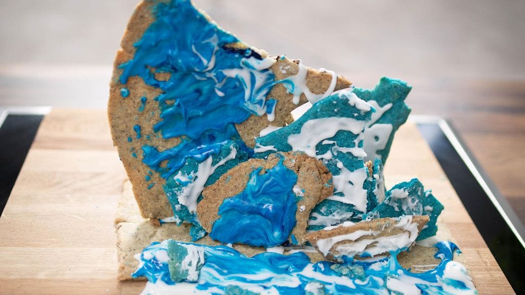 SITRUUNAKEKSITAIKINA: Valmista sitruunakeksitaikina: Vaahdota voi, sokeri, sitruunan kuori ja mehu sekä väriaine keskenään, kunnes seos on pehmeää ja kuohkeaa. Valmista houjichakeksitaikina vaahdottamalla voi, sokeri, houjicha ja vesi. Lisää molempiin taikinoihin jauhot ja sekoita. Kääri taikinat kelmuun ja jäähdytä niitä hetki jääkaapissa. Kauli houjichataikina n. 2,5 cm paksuiseksi, uuninpellin kokoiseksi levyksi. Tee levyyn 3 lovea aaltojen upottamista varten. Kauli sitruunakeksitaikina n. 1 cm paksuiseksi levyksi.