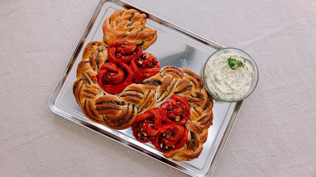 PUNAJUURILEIVÄN TÄYTE JA TÄYTTÄMINEN: Pilko saksanpähkinät rouheeksi. Jaa levännyt punajuuritaikina kuuteen osaan ja kaulaa niistä jokainen ohueksi, pitkäksi soikioksi (n. 20 x 6 cm). Leikkaa pituussuunnassa kolmeen säikeeseen siten, että osat yhdistyvät edelleen yläreunasta. Letitä säikeet. Lisää lettien päälle täytteet. Kieritä ruusuiksi. Kohota. Paista 200 asteessa n. 30 minuuttia sienileivän kanssa.