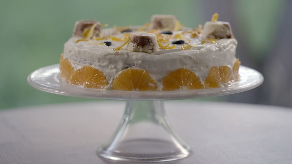 KAKKUPOHJA: Vatkaa huoneenlämpöiset munat ja sokeri sähkövatkaimella vaaleaksi, jämäkäksi vaahdoksi. Yhdistä kuivat aineet ja siivilöi nostellen joukkoon. Kaada taikina voilla ja korppujauhoilla voideltuun kakkuvuokaan ja paista uunissa 200 asteessa noin 8 minuuttia. Halkaise kakkupohja kahtia. Leikkaa alemmasta pohjasta pois mutakakun kokoinen ympyrä.